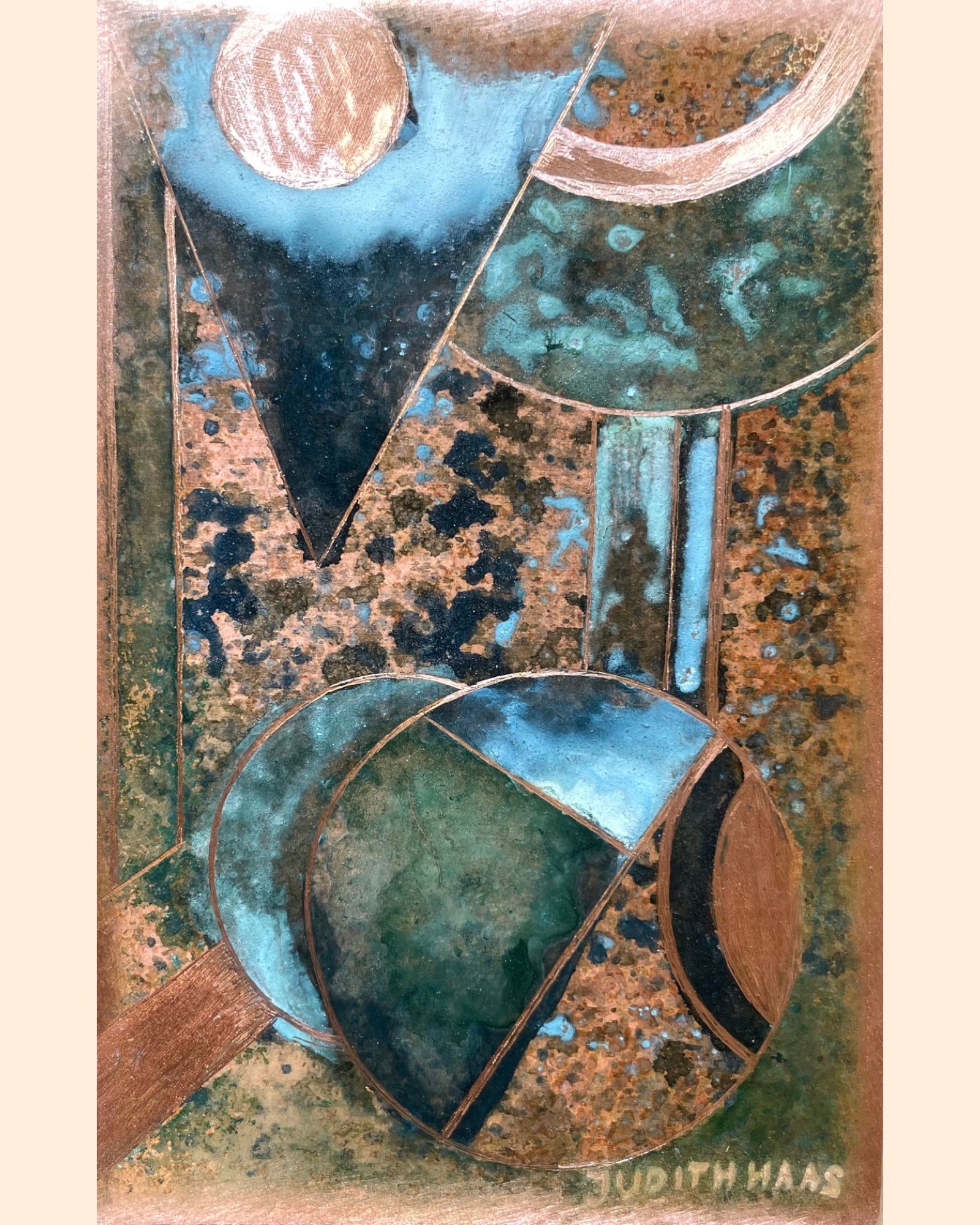 Using colorful patinas on hand etched copper alloy, she celebrates the reclamation of flora and fauna on industrial structures.