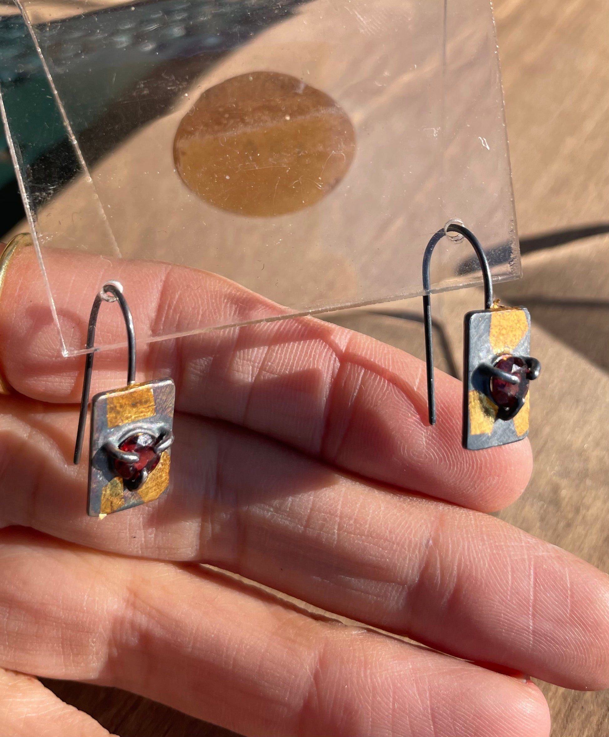 Garnet set in oxidized Sterling Silver fused with 24k Gold Leaf.