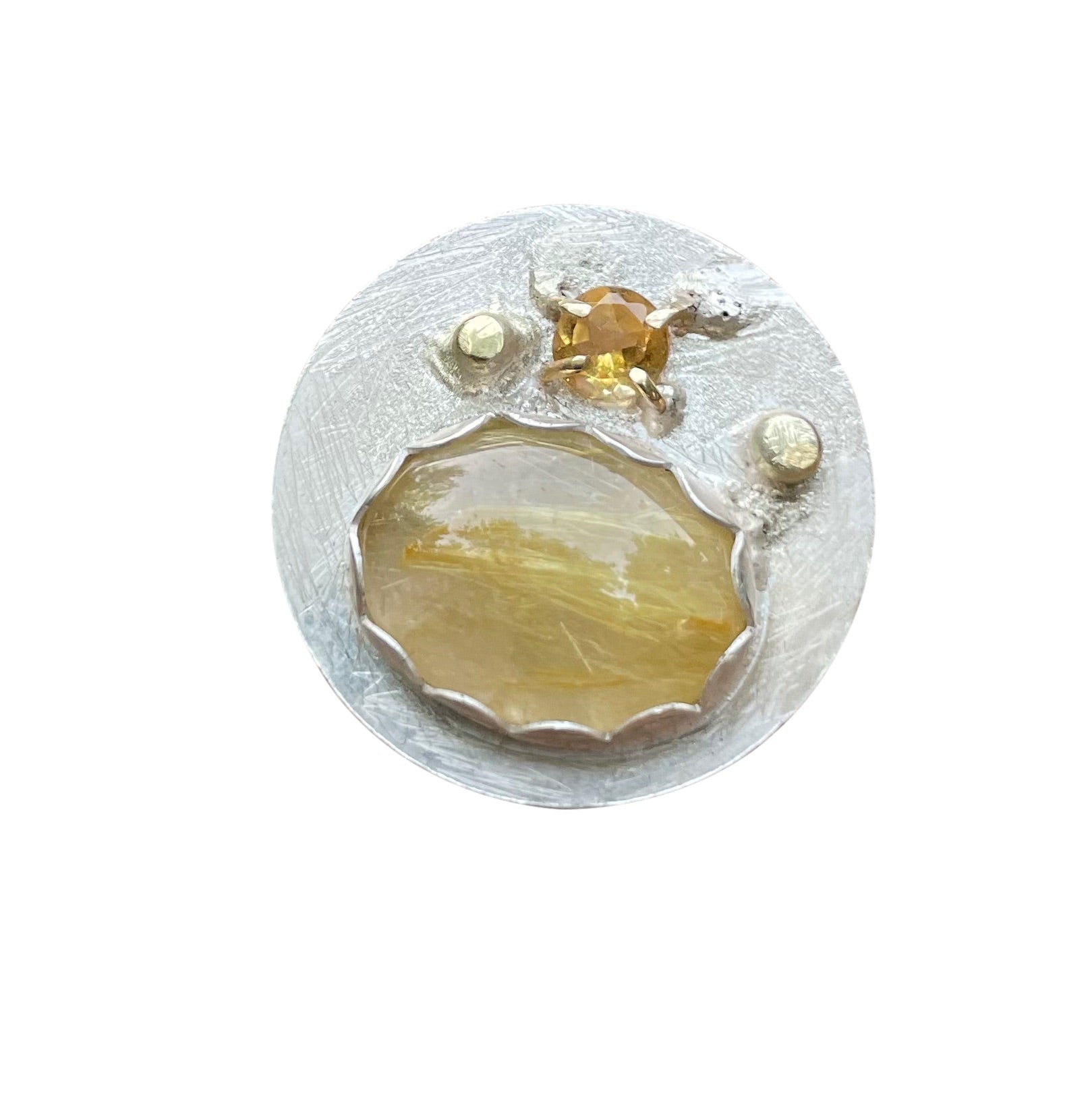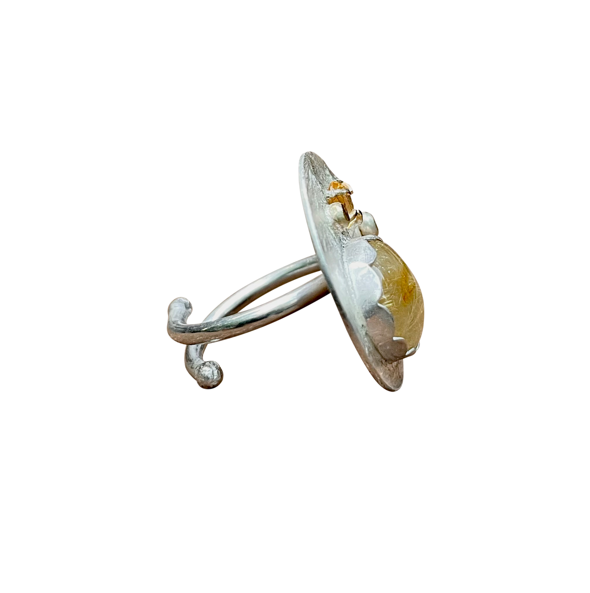 Rutilated Quartz and Citrine set Sterling Silver with Gold accents adjustable ring. One Size Fits All
