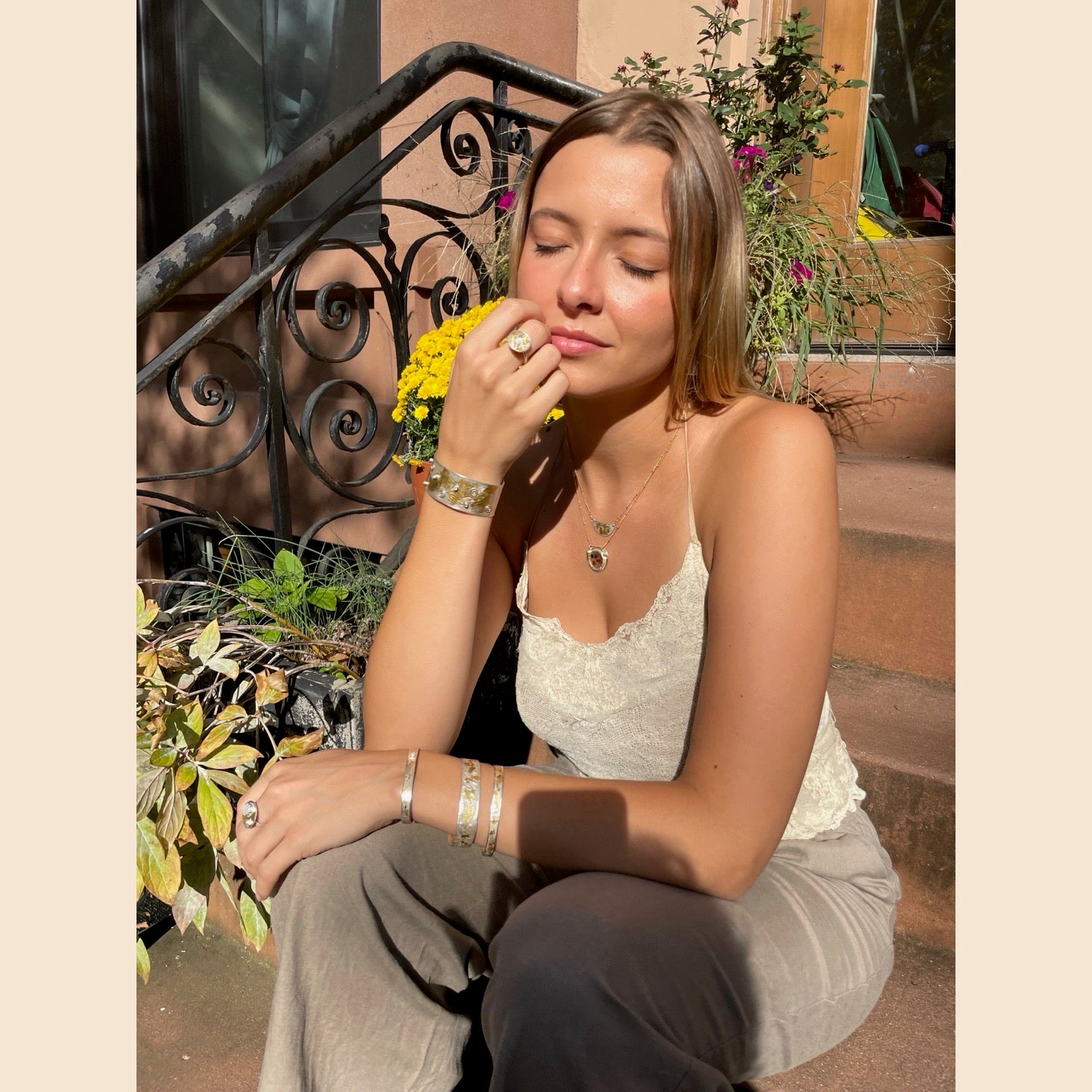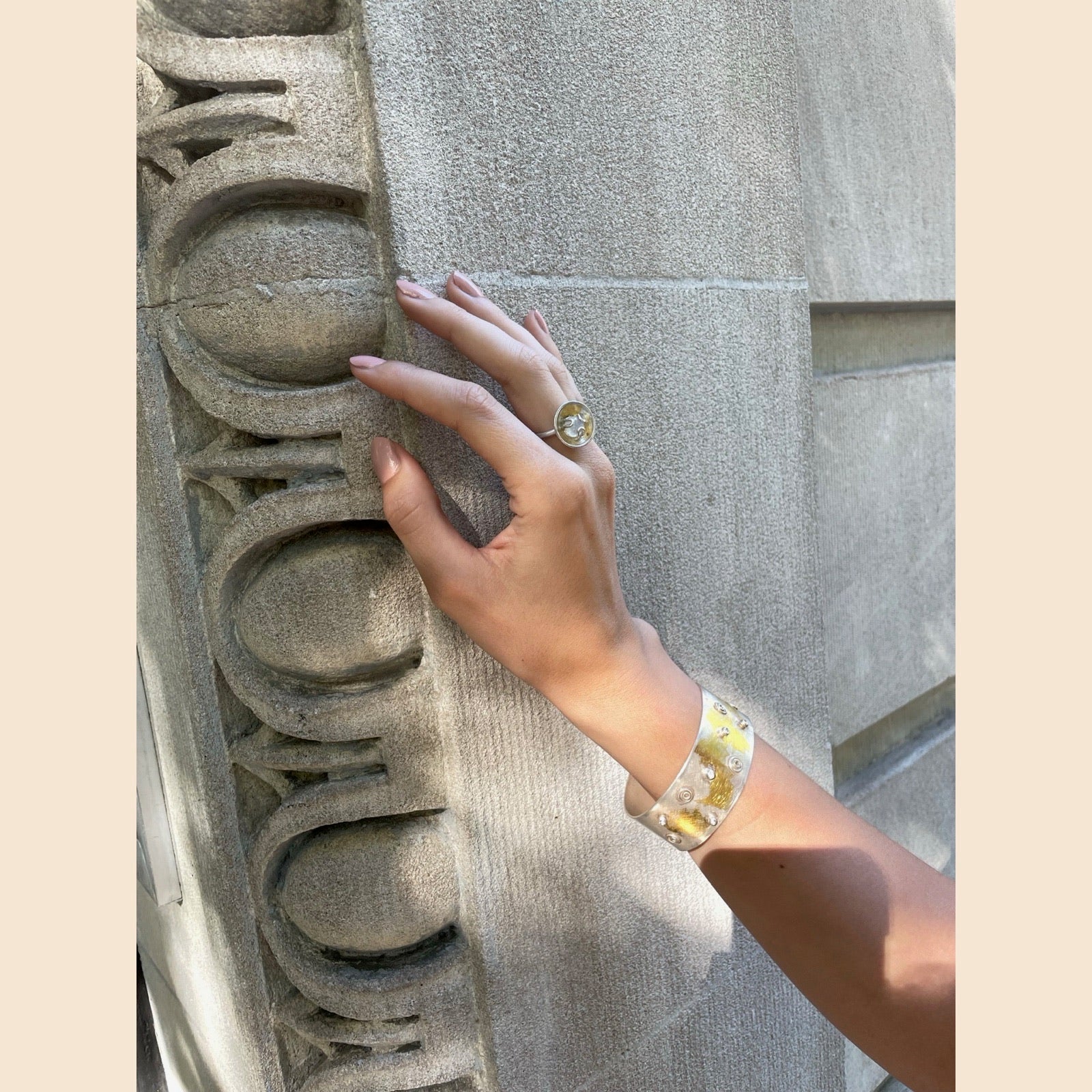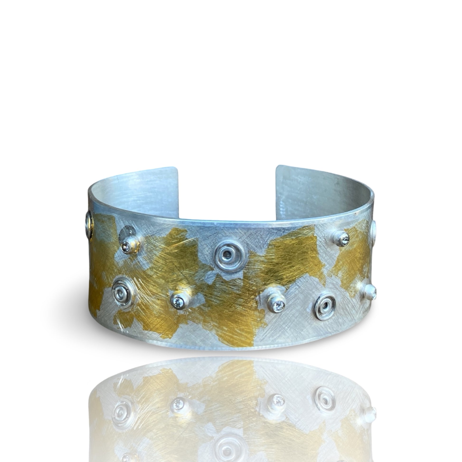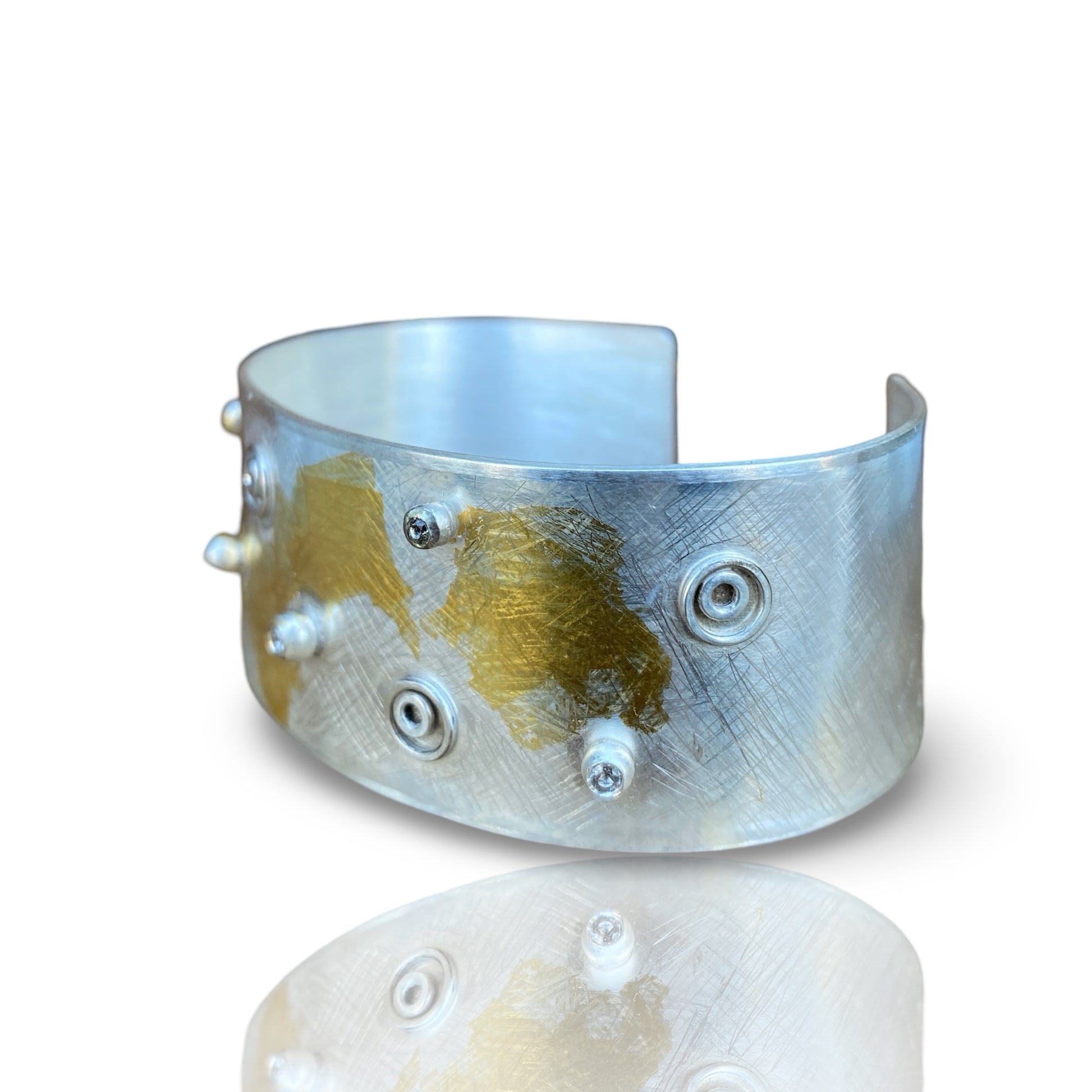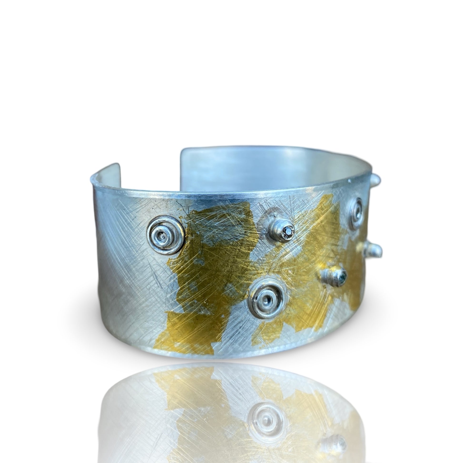 Fine Silver adjustable bracelet, fused with 23k gold leaf. Cultivated white Sapphire accents