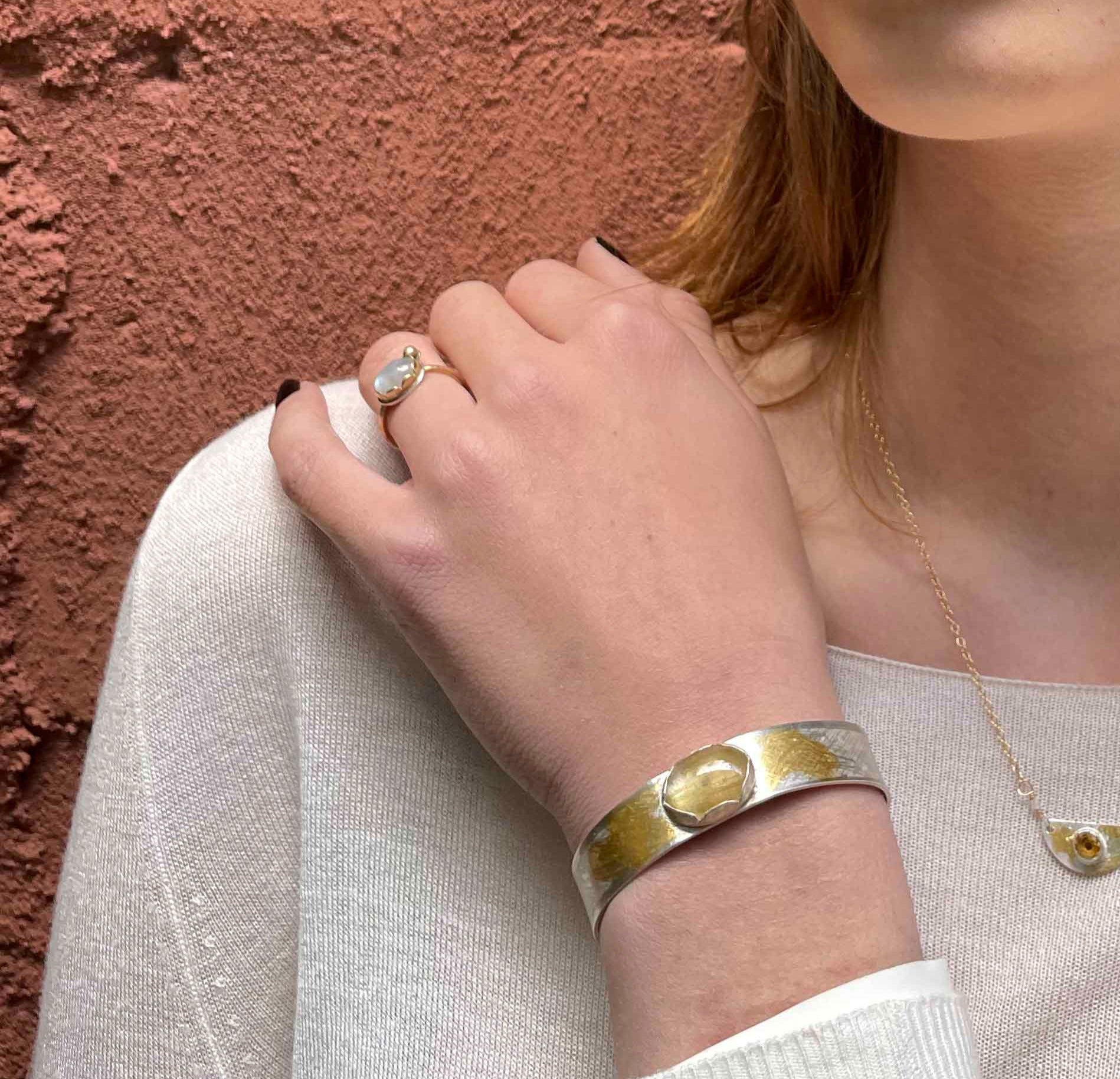 Moonstone set in 14k recycled gold ring with Fine Silver baseplate