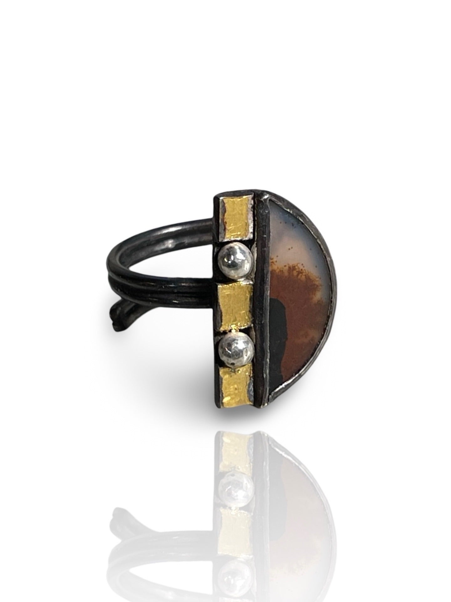Dendritic Agate set in partially oxidized sterling silver with 24k gold leaf infused on.