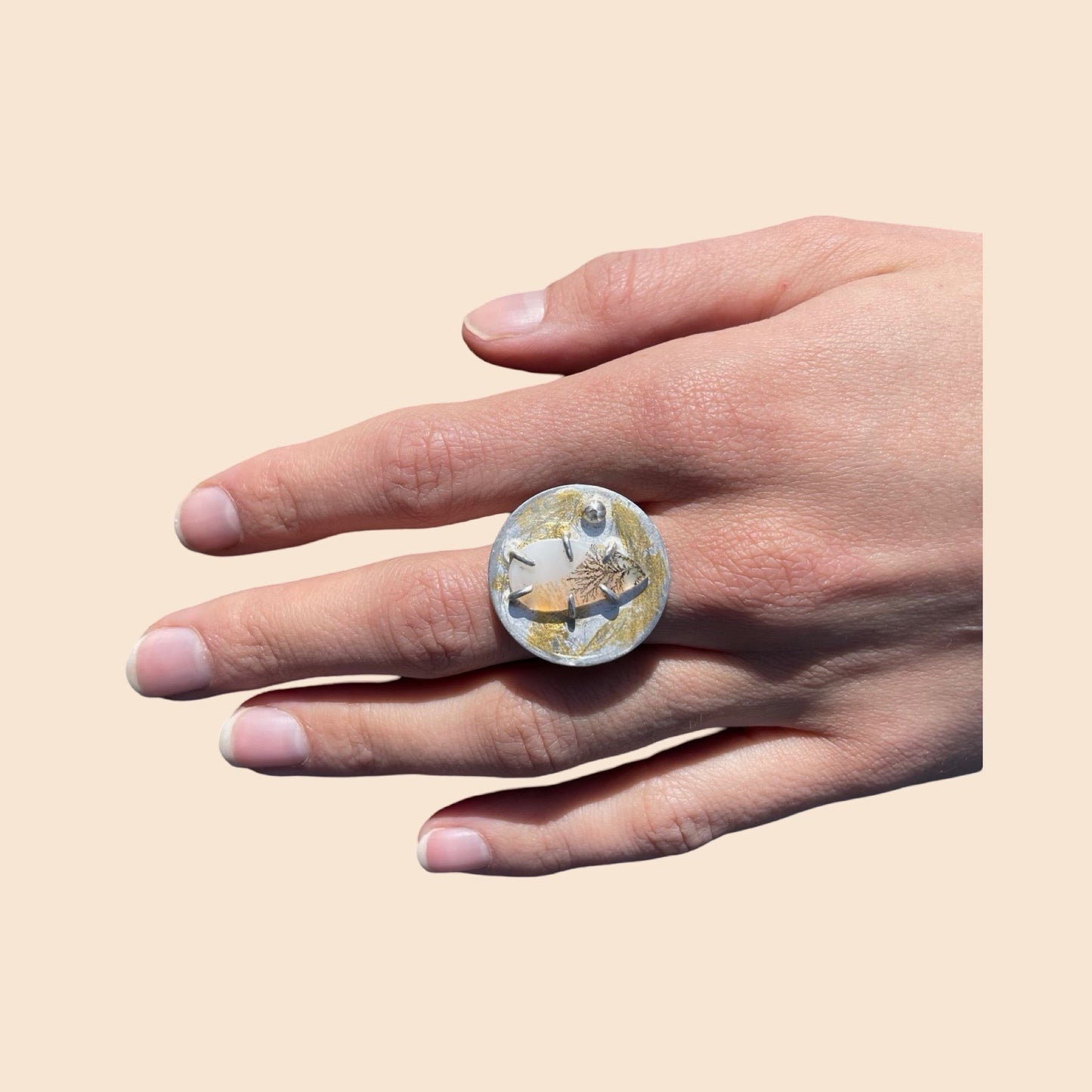 Dendritic Agate set on 1 inch fine silver disc fused with 24K gold leaf.