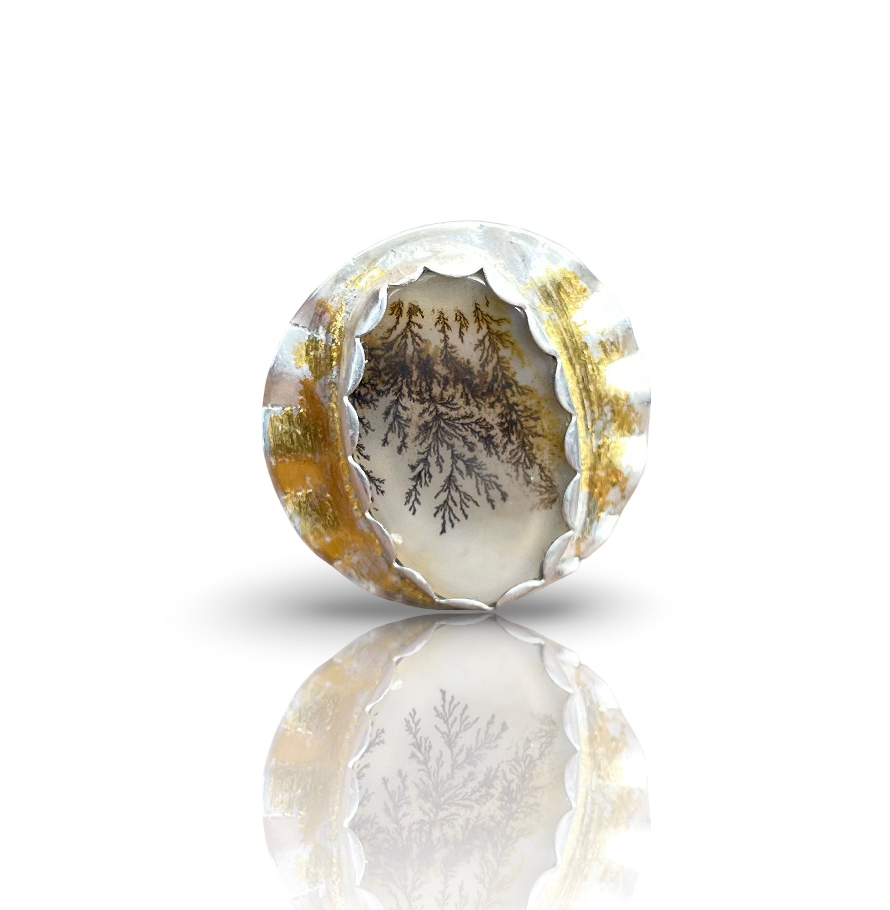 Dendritic Agate set on 1 inch fine silver disc fused with 24K gold leaf.