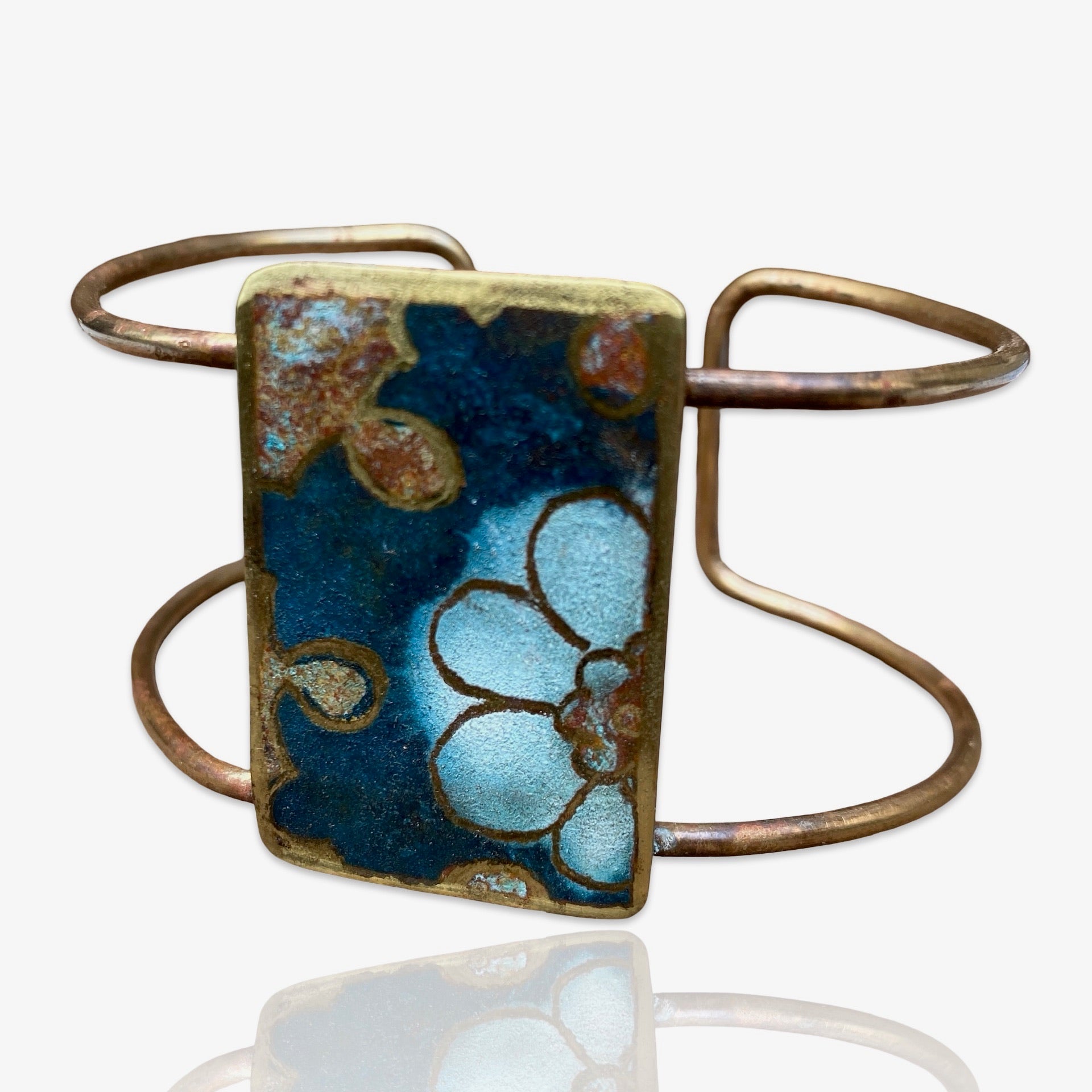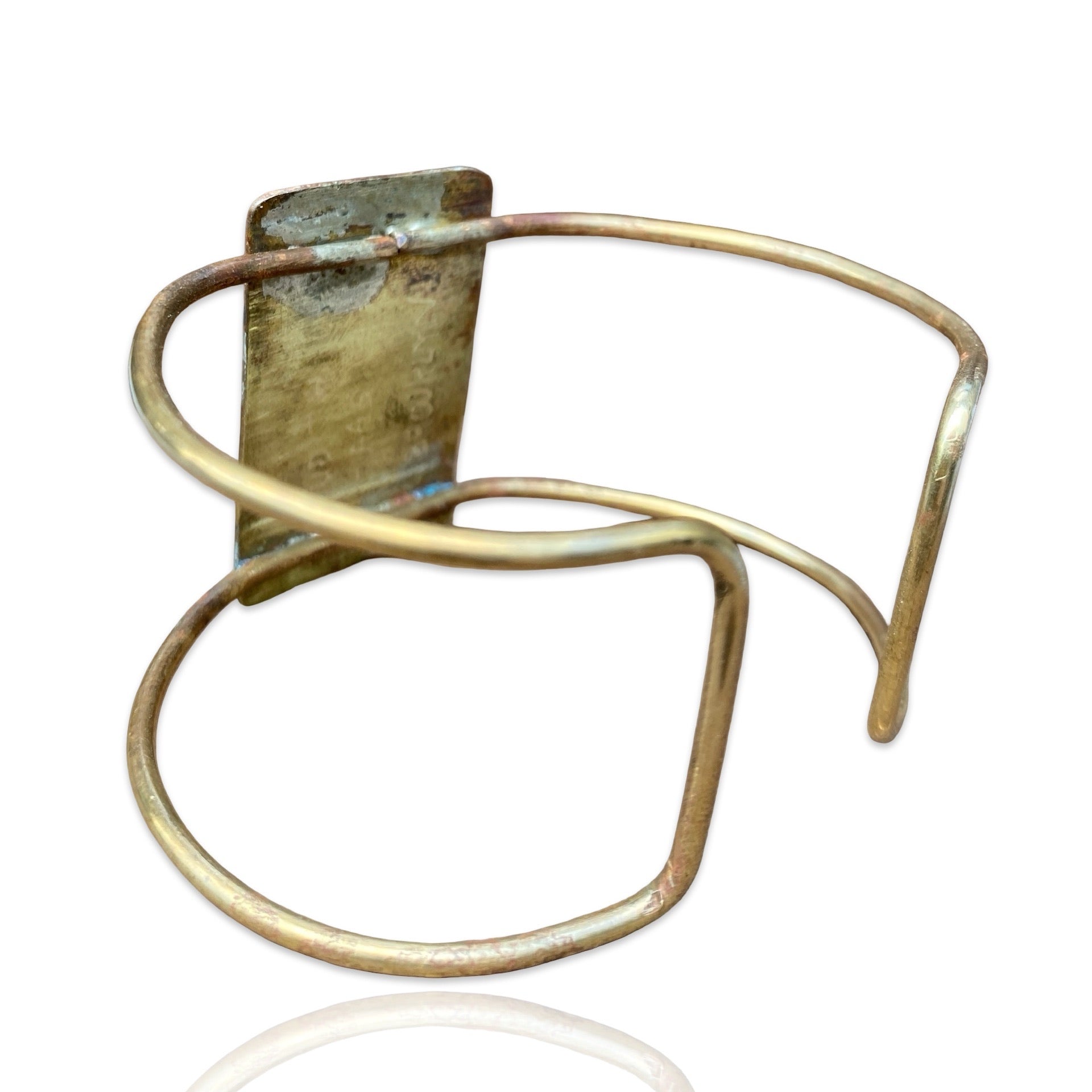 Brass bracelet with patina and pigmented patina, and hand engraved.