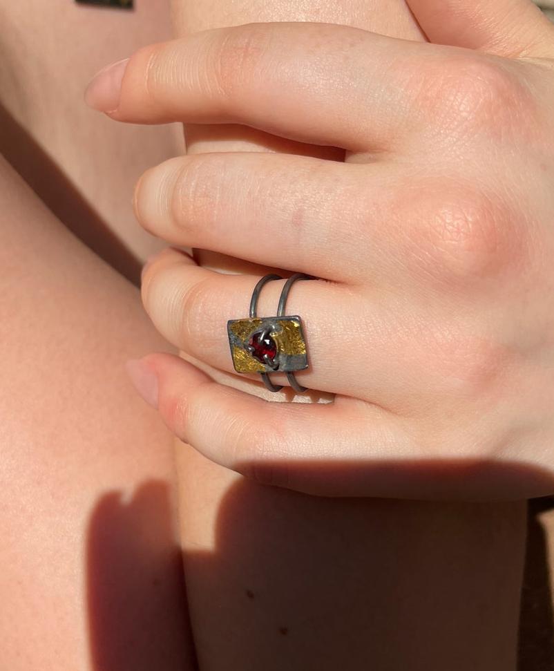 Garnet, fused with 24K gold and oxidized.
