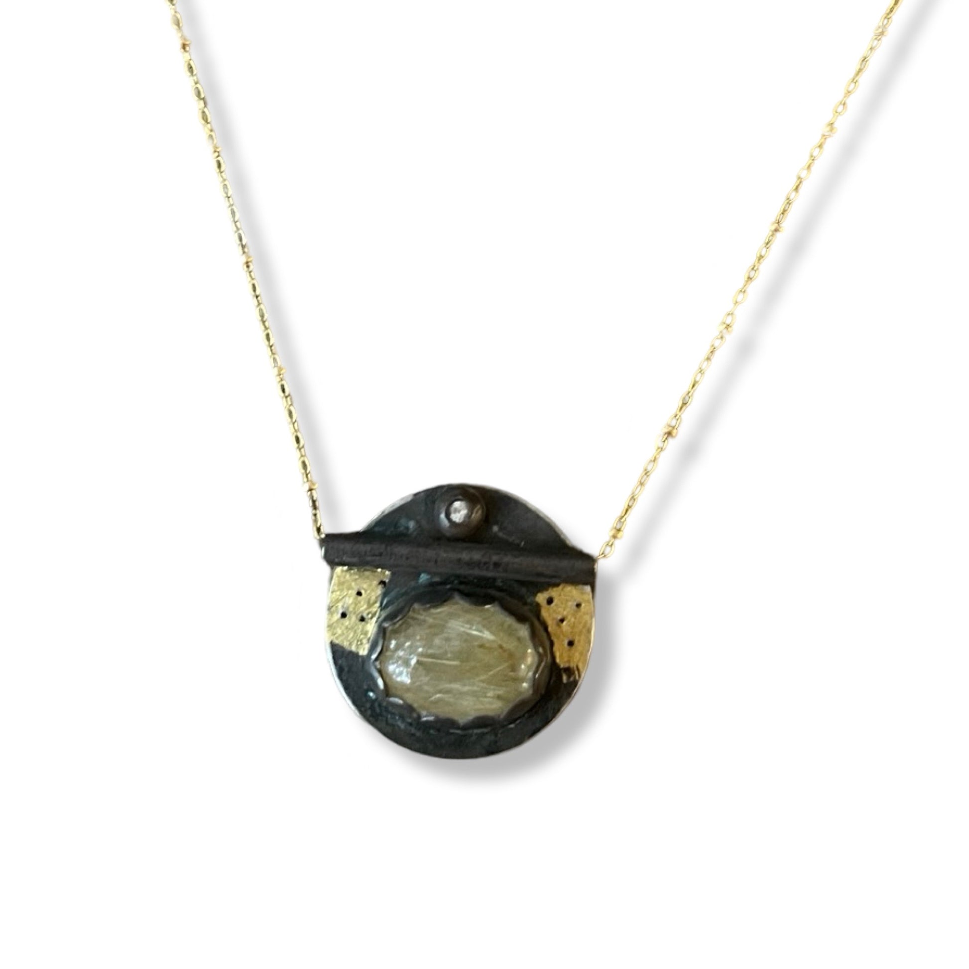 Rutilated Quartz set in oxidized fine silver (0.99) with 24K gold leaf infused on.