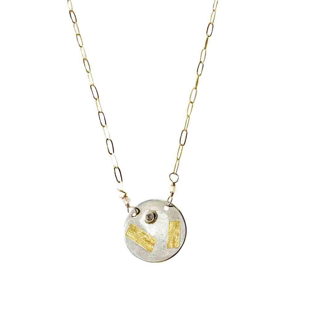 Cultivated White Sapphire set in Fine Silver, with 24k gold leaf pendant. 15 inch fine gold filled chain with 2.5 inch extension chain ( 17.5 inch total) Ask for costume made length.