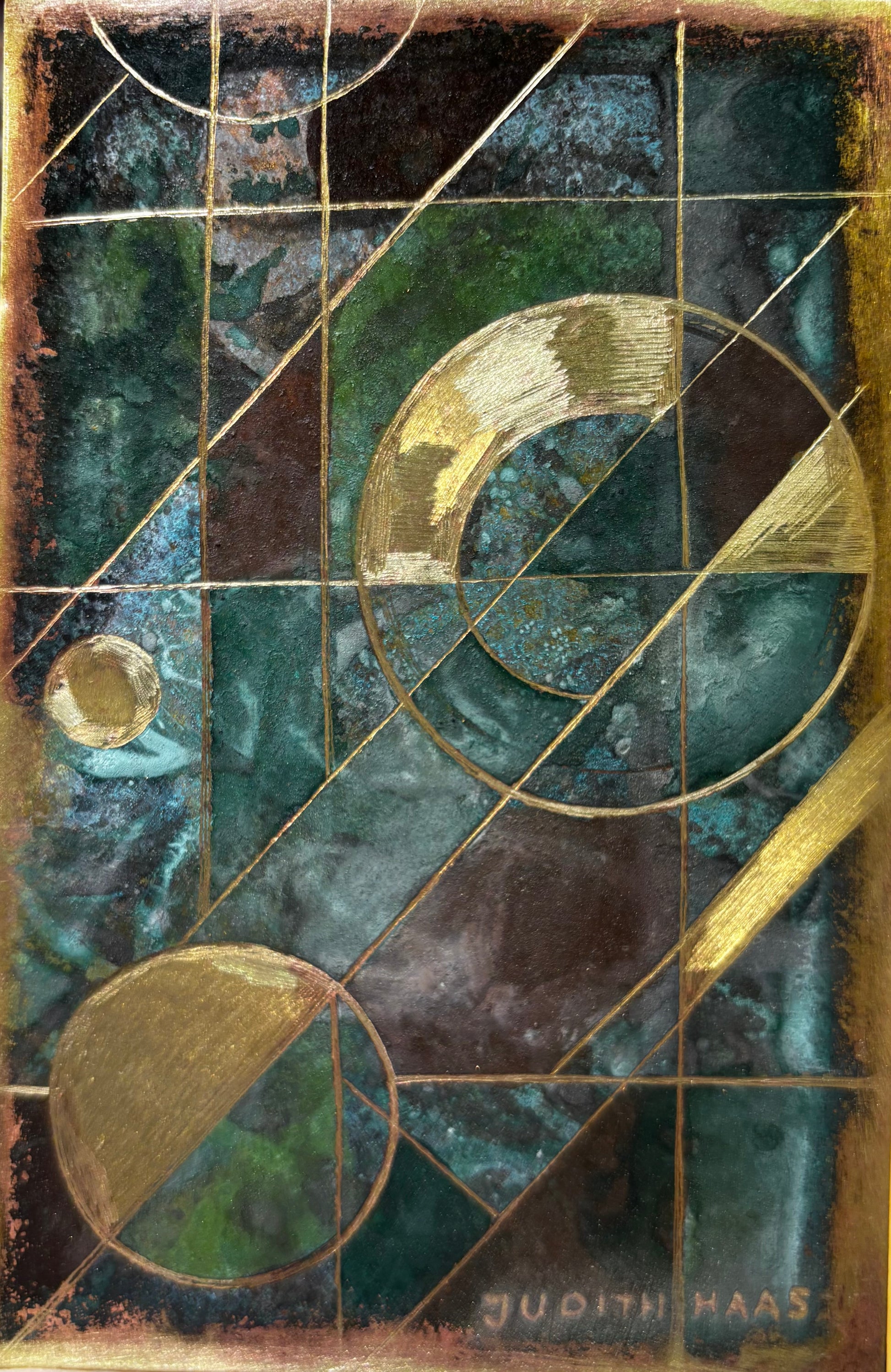 Using colorful patinas on hand etched copper alloy, she celebrates the reclamation of flora and fauna on industrial structures.