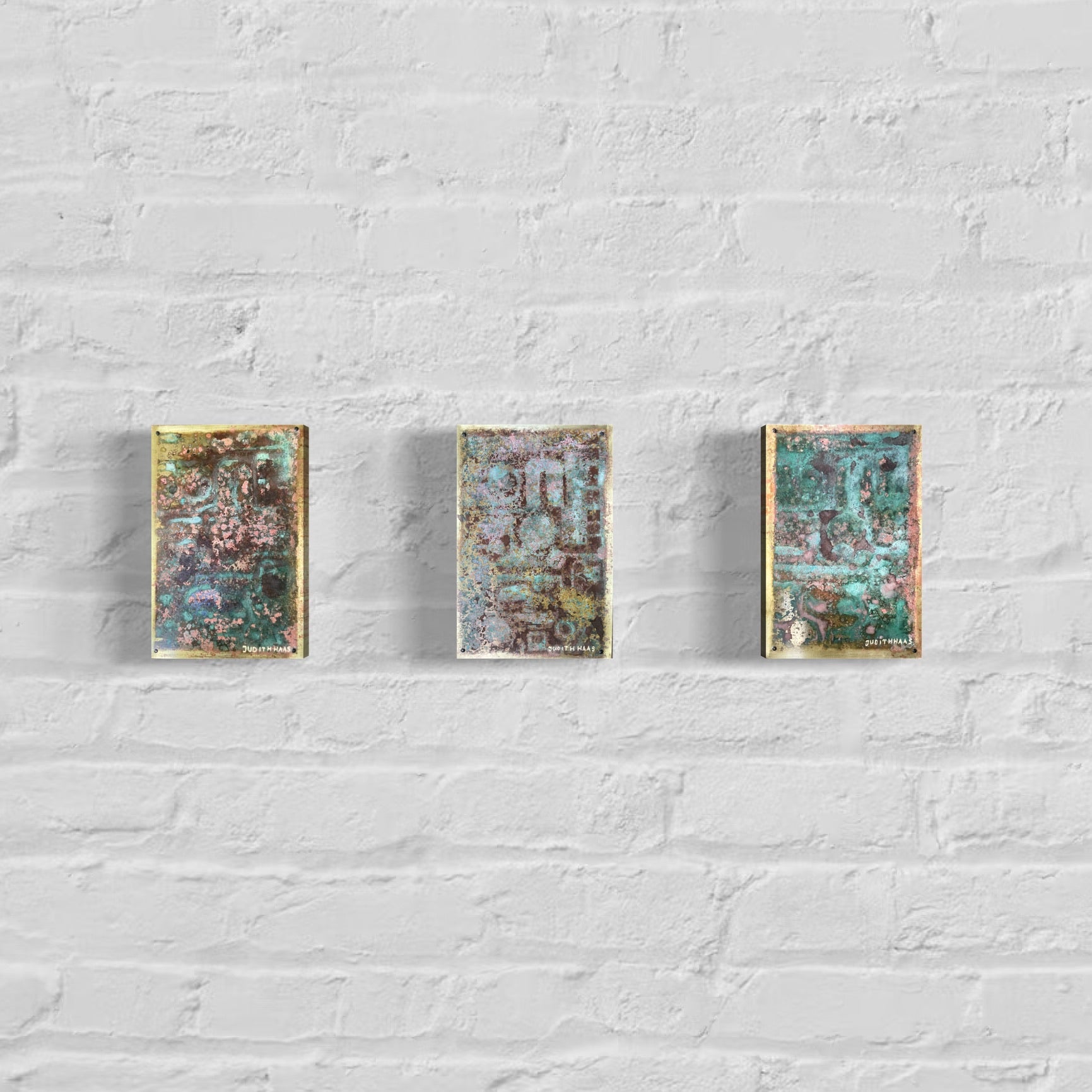 Using colorful patinas on hand etched copper alloy, she celebrates the reclamation of Flora and fauna on industrial structures.